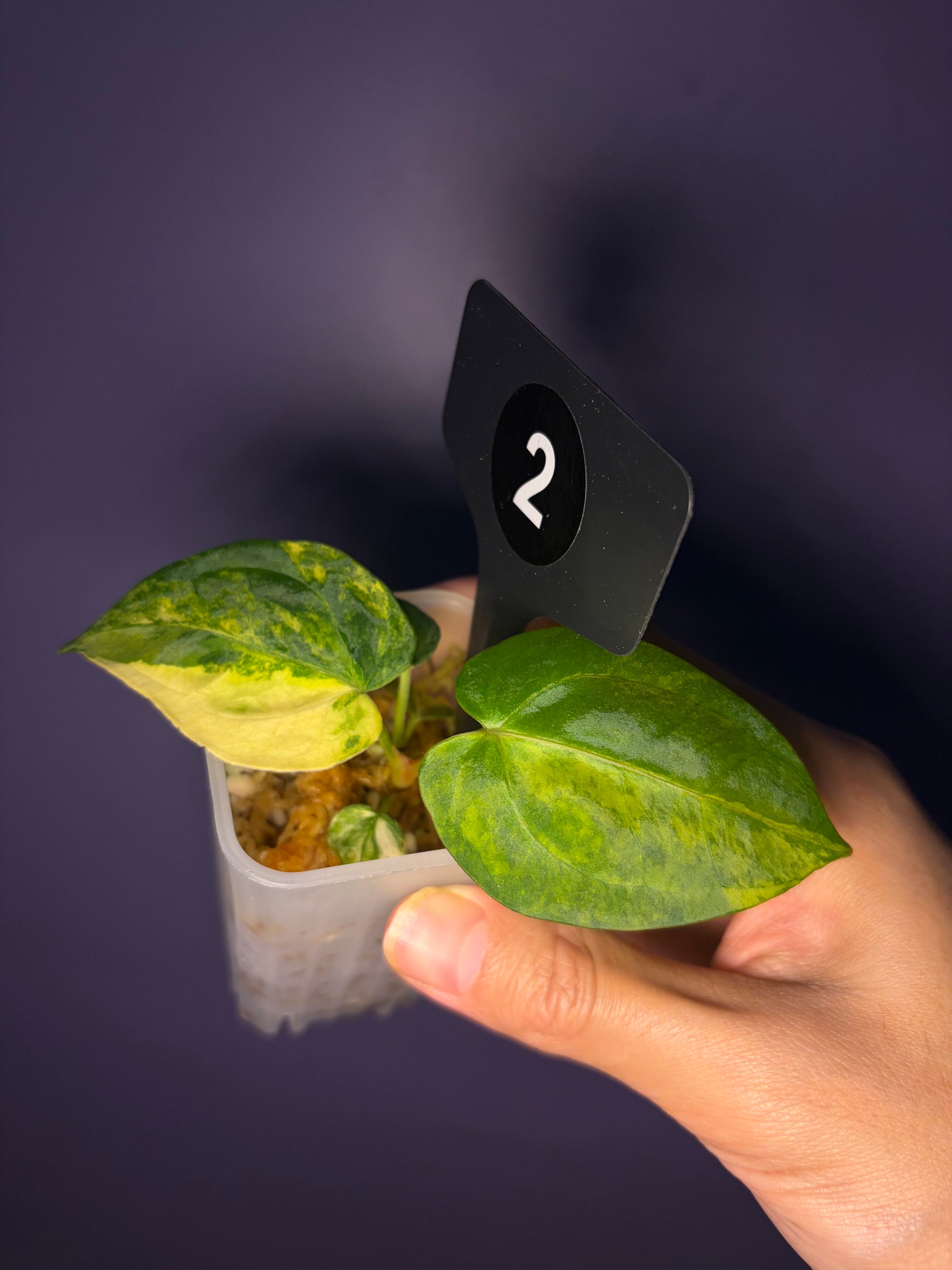This Anthurium papillilaminum var. × ‘Black cherry’ has beautiful variegated pattern and thicker leaves compared to other variegated anthurium. The pollen donor ‘Black cherry’ is an Australian hybrid anthurium which has dark velvet leaves. We expected that this seedling will has more traits from the parent plants when they size up.