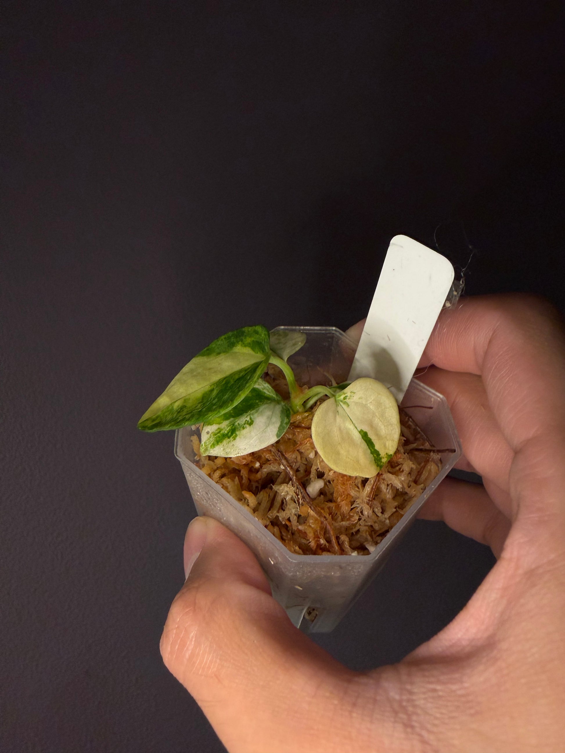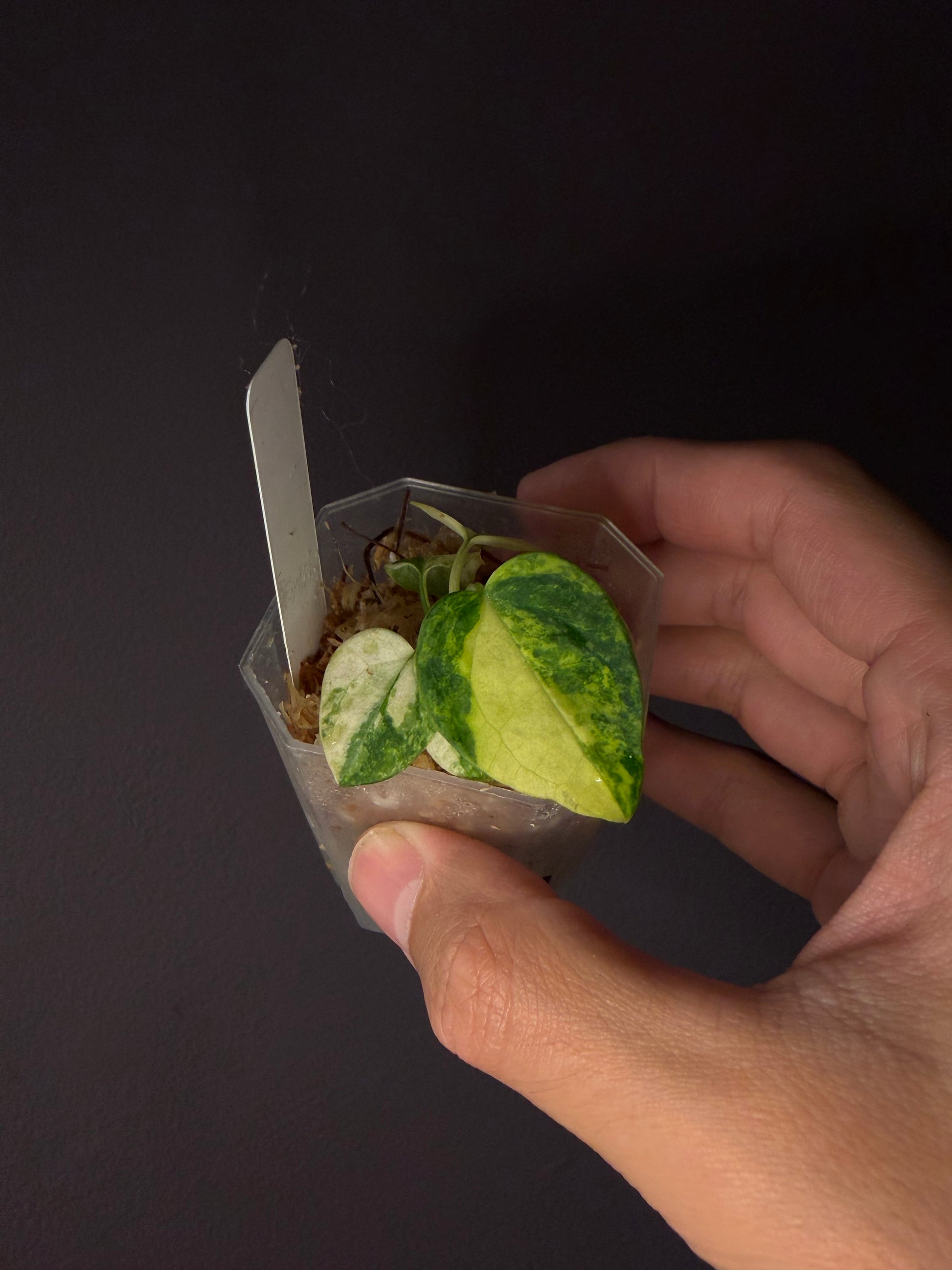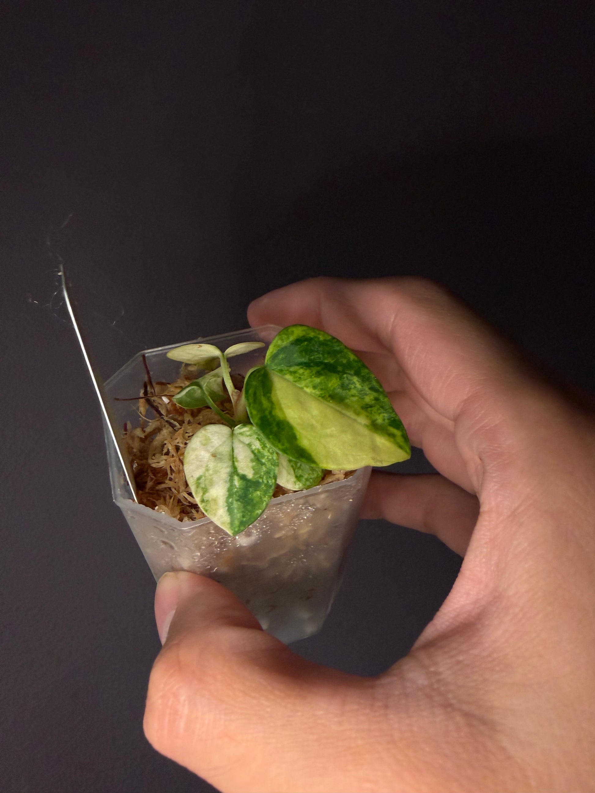 This is the selfed seedling of Anthurium papillilaminum var. OG clone, with beautiful variegated patterns.
