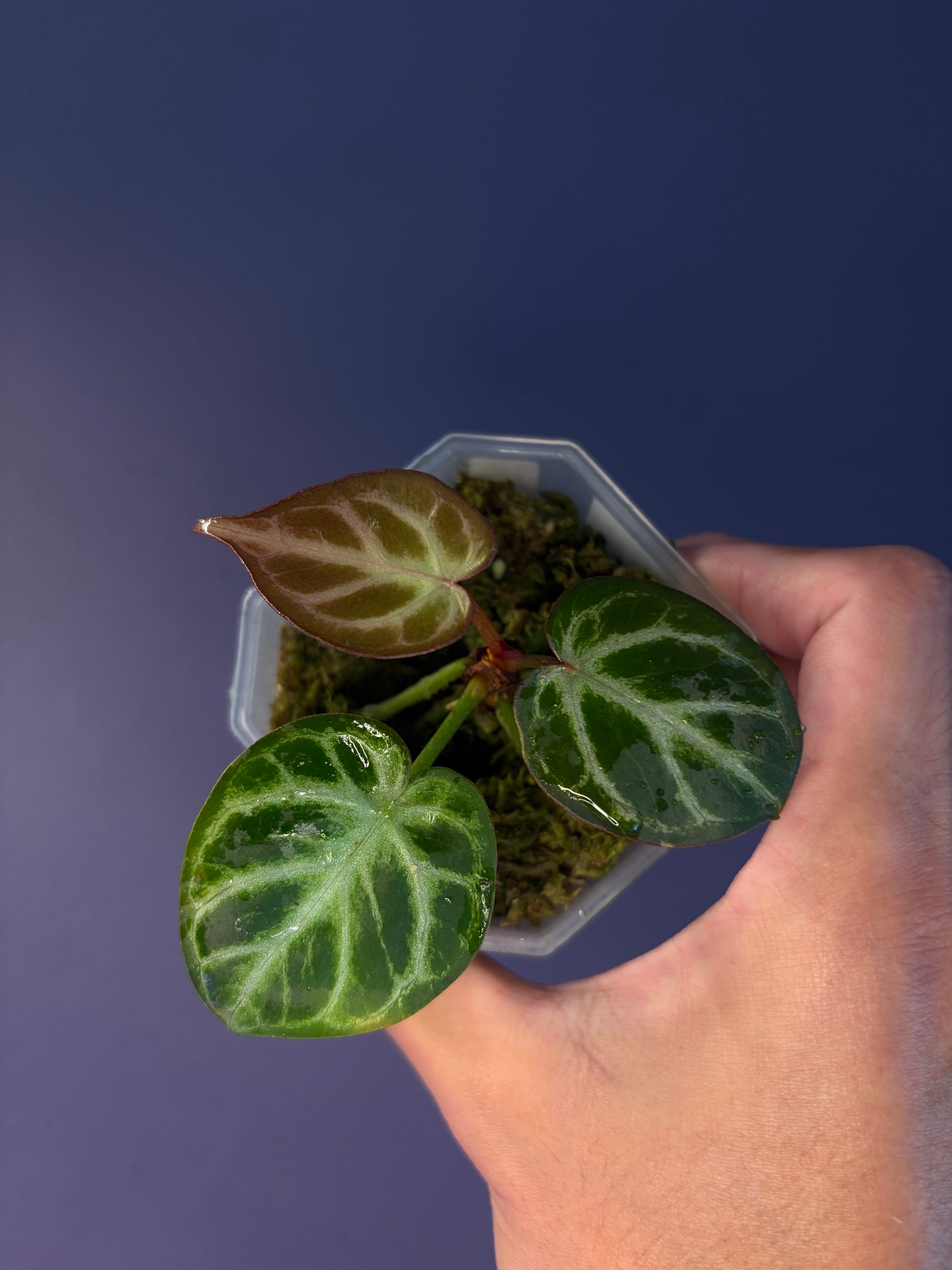 This Anthurium ‘Silver purple’ is a mutated silver blush with pink and purple emerging leaves.
