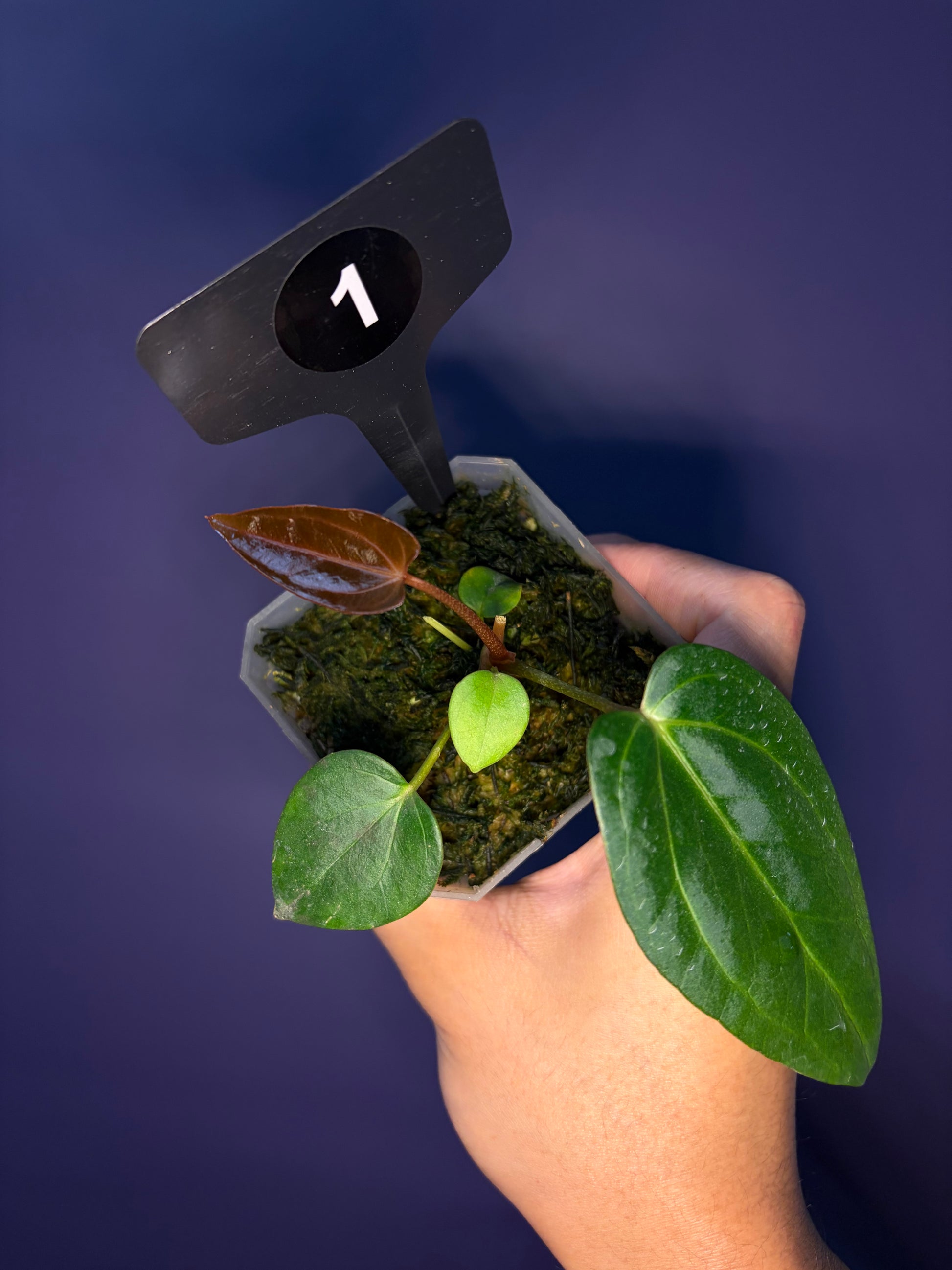 Ce Anthurium carlablackiae × ‘Indo Portillae’ est désormais prêt à rejoindre son nouveau foyer. Nous nous attendons à ce que cet hybride hérite principalement des caractéristiques de Carla issues de la plante mère, avec un sinus large provenant de l’Indo Portillae.