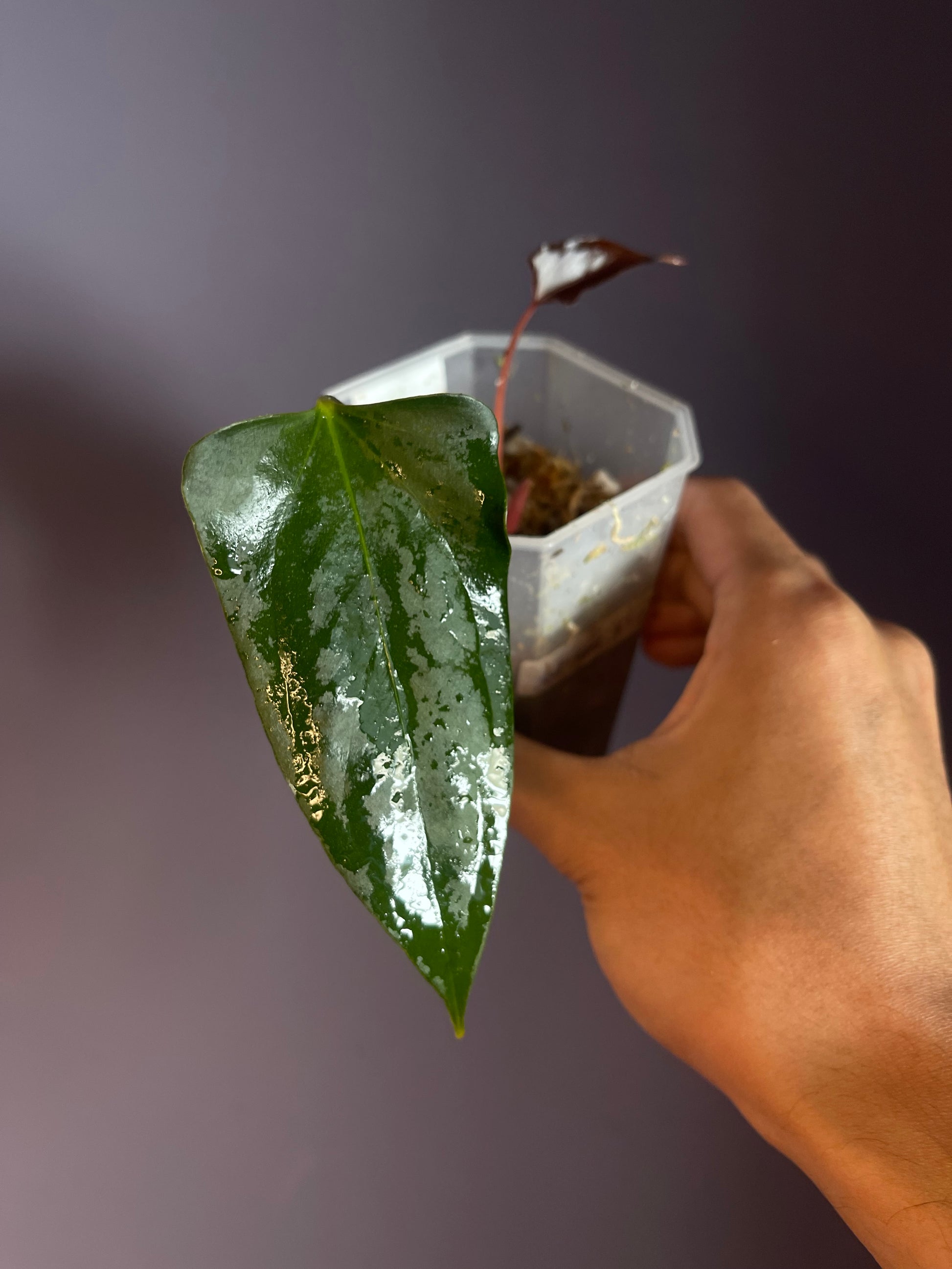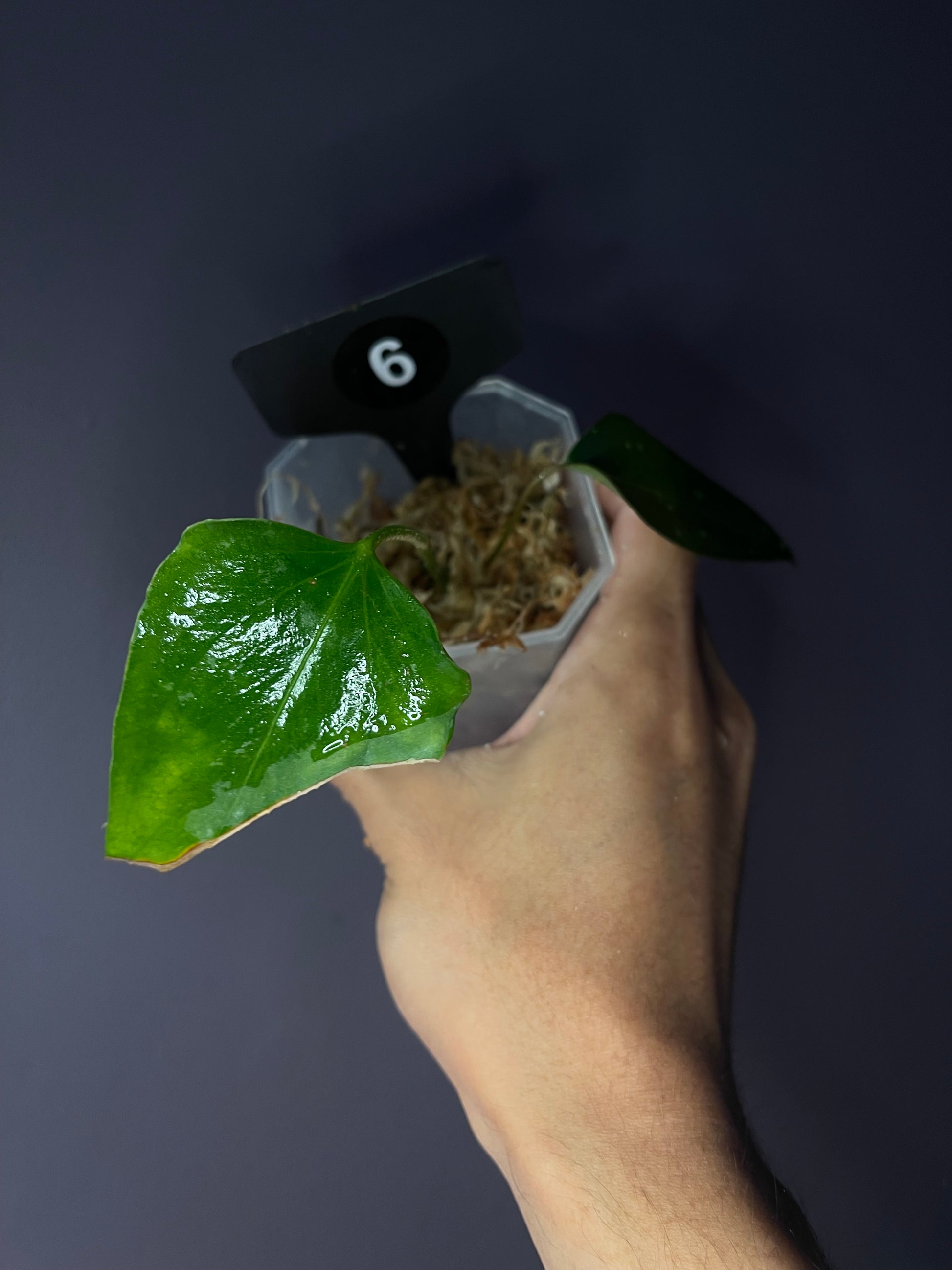 The selected ‘black sweet’ has beautiful flat and ruffled sinus with dark red leaves. The stem of this selected ‘black sweet’ seems to be longer than regular anthurium. So it will be easy to be propagated by cutting the stem. The mother plant is NFS.