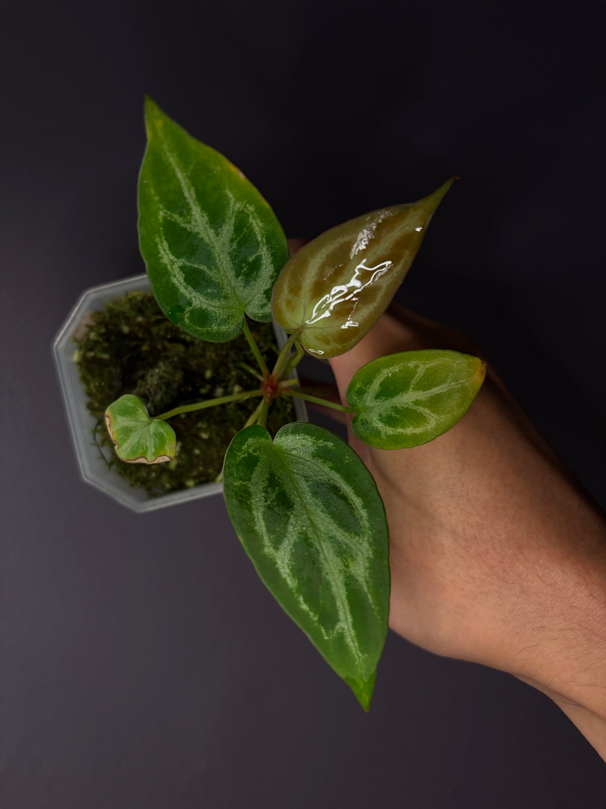 This Anthurium ‘Silver Butterfly’ is a beautiful cultivar with silver veins and ‘butterfly’ shape of wide sinus. The wide sinus will show up more when the plant matures.